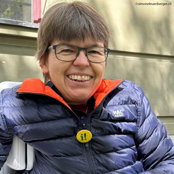 ««Da oltre vent’anni condivido un appartamento in un’azienda agricola. Nel tempo libero gioco a Powerchair Hockey, faccio escursioni nella natura in sedia a rotelle o giro con il camper. Insegno economia e diritto al liceo, sono attiva nel campo della rappresentanza degli interessi delle persone con disabilità e sono eletta nel Gran Consiglio bernese per il PEV.» »